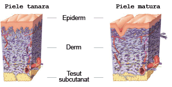 Dermul contine colagen si elastina care sunt responsabili de fermitatea si elasticitatea pielii. Cu inaintarea in varsta pielea devine mai uscata (prin deshidratare), mai putin elastica si prezinta aspect de oboseala.